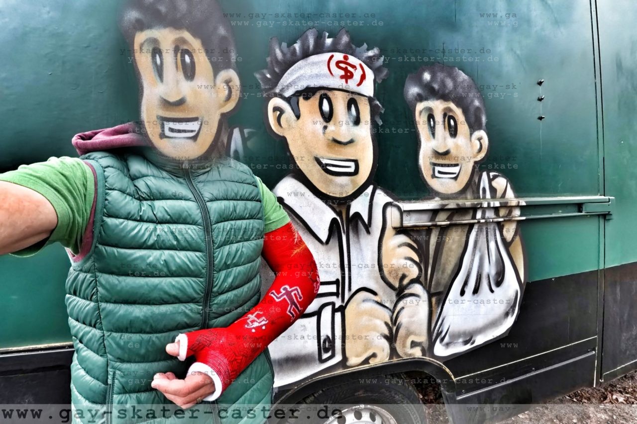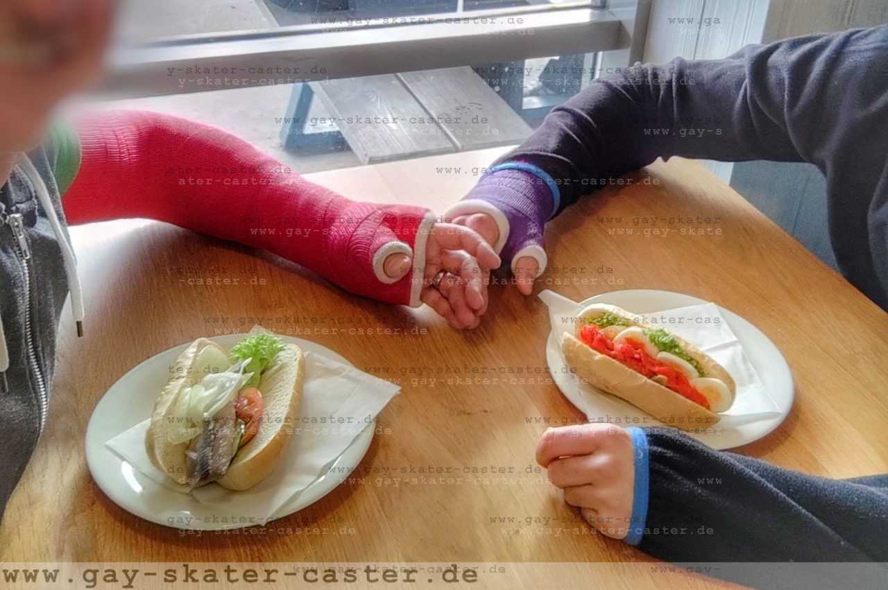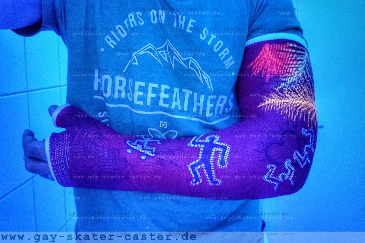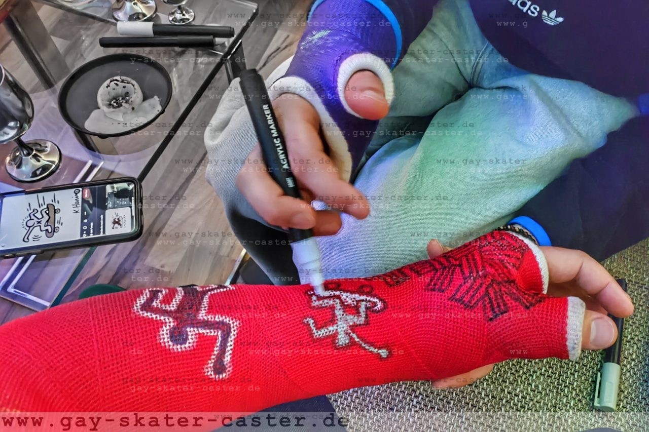 A small #CastFest with my fellow caster mar.cast in Hamburg. We both hat a #lats: mine was a #red one on the left and he got a #purple one on the right wing. I got some beautiful drawings on my cast from him. He’s really a genius in sketching on the cast. We went out for clubbing and had a great and long kinky party night.